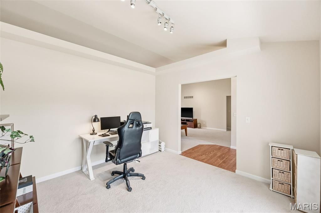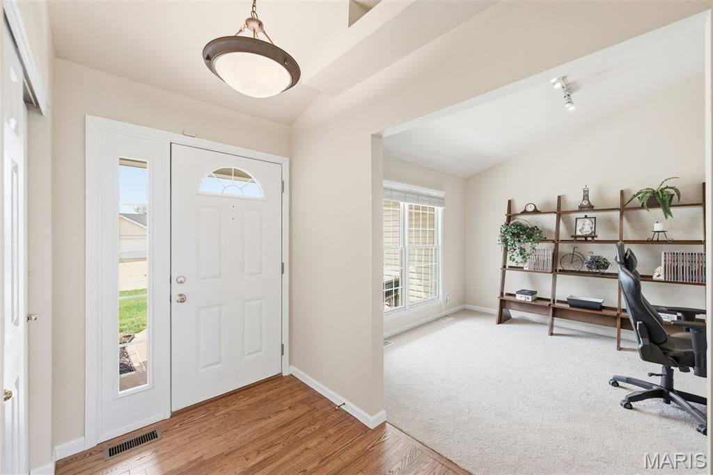 Welcome Home to this beautifully maintained ranch, perfectly situated on a quiet street in highly sought-after Fort Zumwalt South school district with easy access to shopping, dining, parks, and major highways. From the moment you arrive, you'll be impressed by the home's curb appeal and inviting presence. Step inside to an airy, open floor plan enhanced by soaring vaulted ceilings, abundant natural light, and a warm, woodburning fireplace that anchors the main living space. Fresh paint, new carpet, and stylish luxury vinyl flooring in the bathrooms and main-floor laundry room add a fresh, modern touch throughout. The spacious kitchen is designed to impress, featuring 42-inch cabinets with crown molding, a center island with seating, and a seamless flow into the breakfast room-ideal for both casual meals and entertaining guests. A versatile den offers the perfect space for a home office or can easily be transformed into a formal dining room. The main level includes three generously sized bedrooms and two full baths, including a serene primary suite with a walk-in closet and an en suite bath complete with a separate tub and walk-in shower. Convenient main-floor laundry makes everyday living a breeze. Enjoy year-round indoor-outdoor living with a bright enclosed 4 season sunroom and a large patio overlooking the backyard-perfect for relaxing mornings or evening gatherings. The yard is equipped with an irrigation system to keep your lawn looking its best all season long.The expansive, dry, unfinished basement with a rough-in provides endless opportunities to customize and expand your living space to fit your needs. Move-in ready and meticulously cared for, this home offers the perfect blend of comfort, style, and future potential-truly the perfect place to call home.